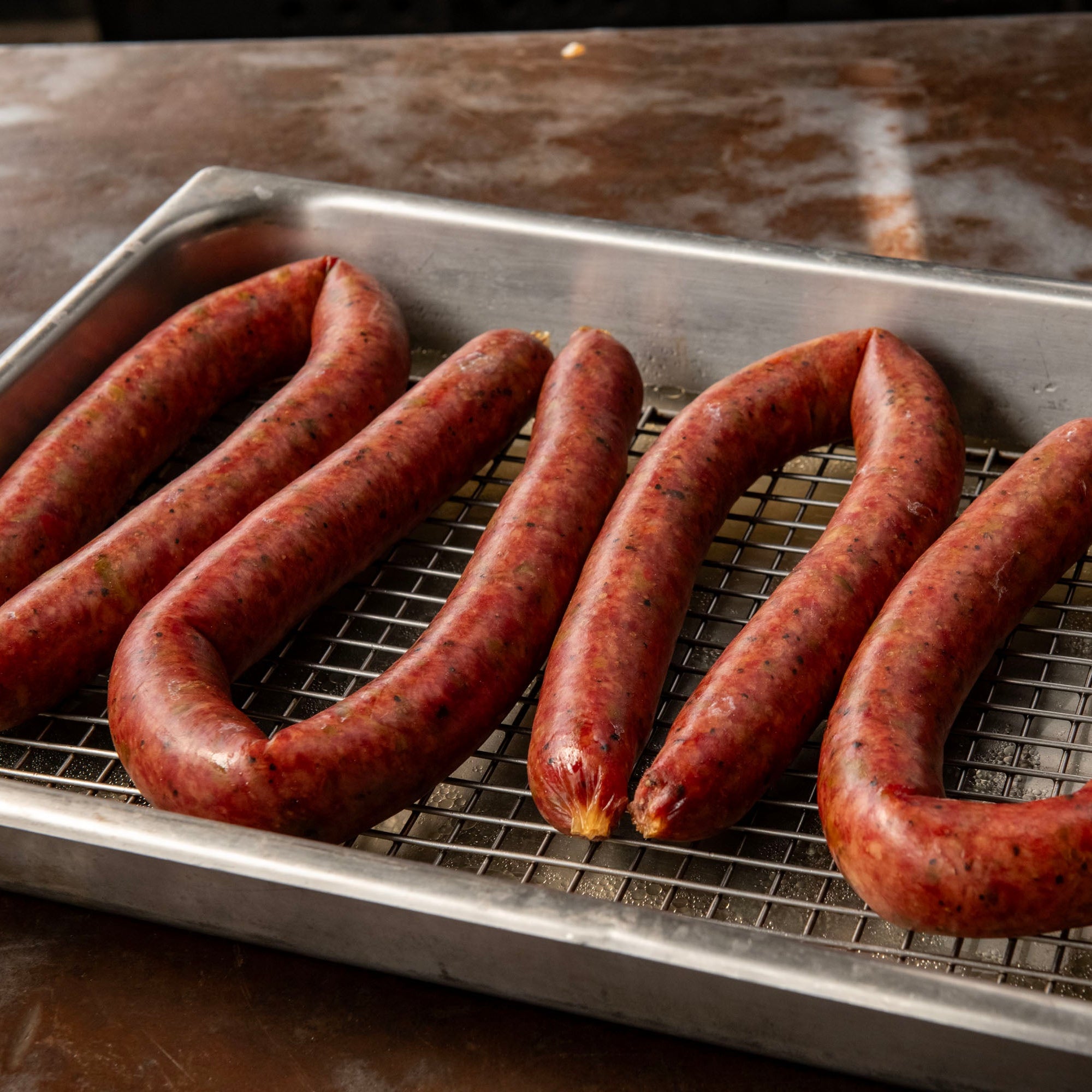 Introducing our newest favorite: Smoked Beef Sausage with Green Chile. Our sausage is crafted from 100% premium beef brisket and mesquite smoked to mouthwatering perfection.